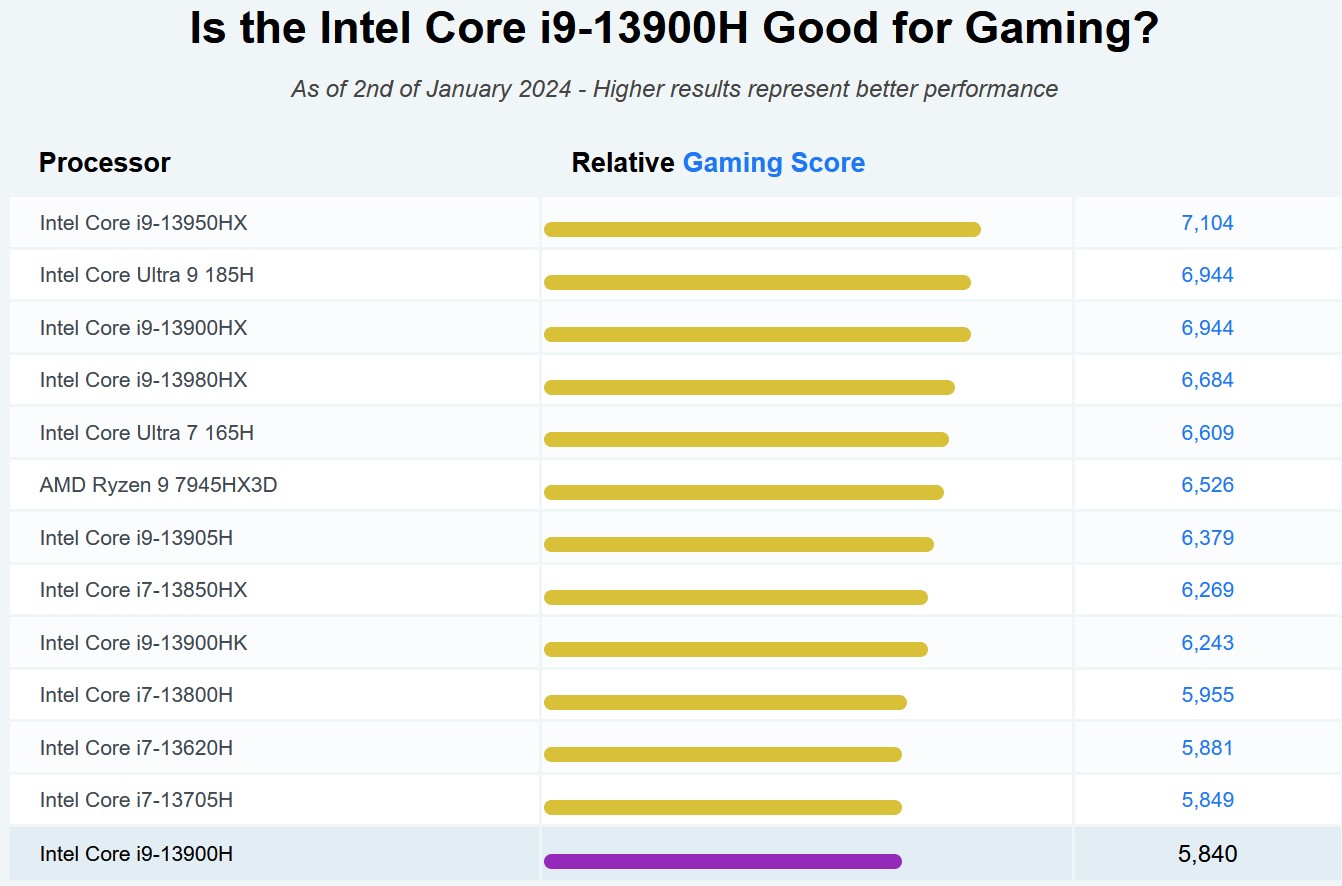 - i9-13900H 14 Cores, 20 Threads, 24MB Cache, up to 5.40 GHz Benchmarks