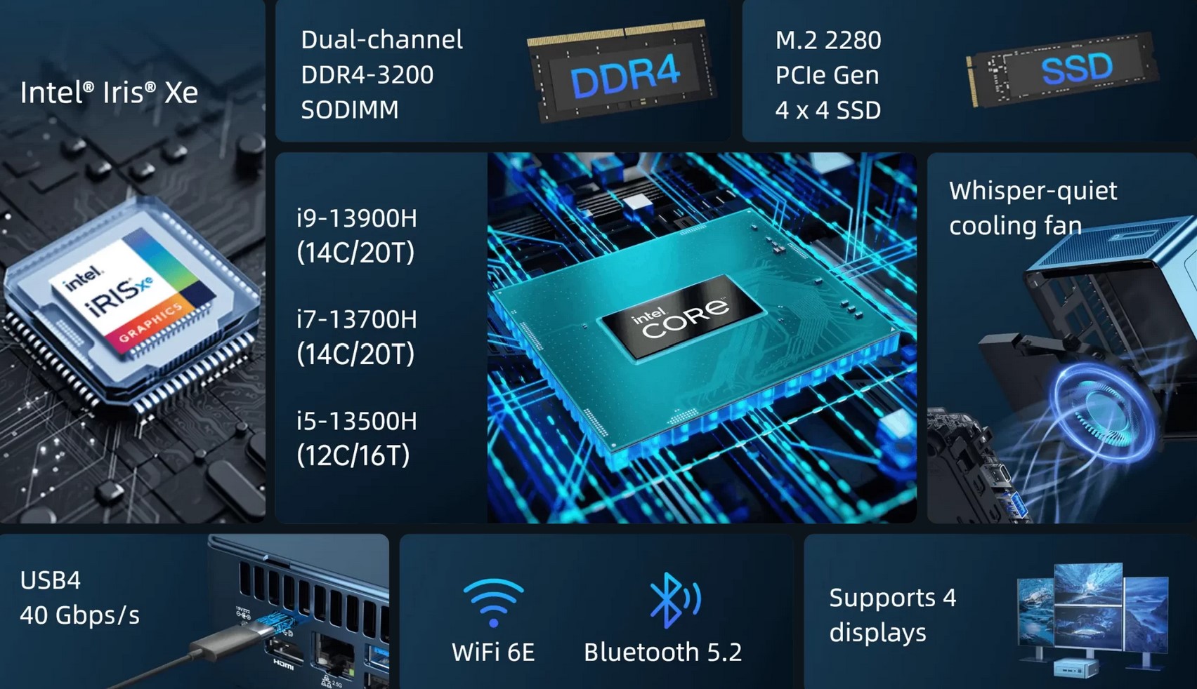 These are all 10nm Intel Raptor Lake-K series for mobile use with a TDP rating of 45W and an i5/i7/19 PL2 of 95/115/115W. This allows for better heat management, and the GEEKOM Mini IT13 has a built-in fan that seldom reaches 45dB.