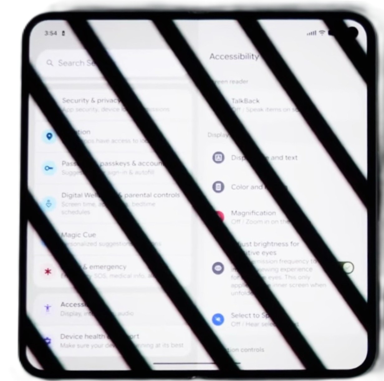 It suffers from Pulse Width Modulation (PWM) with 240/480Hz repeating PWM and a deep modulation until you reach about 80% brightness. There is a setting under Accessibility to slightly reduce PWM on the inner screen, but it achieves little. This flicker will severely affect PWM-sensitive people.