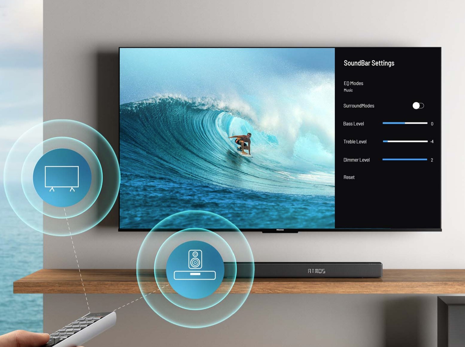 Compatible Hisense TVs have an onscreen menu where you can change mode, add faux surround, change bass/treble, and set LED light brightness.