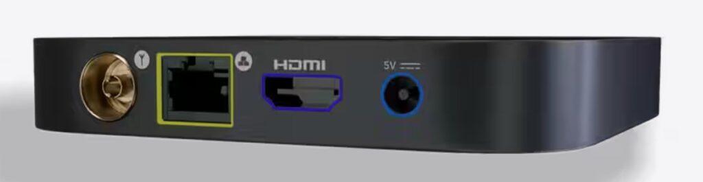 The puck is a small 108 square x 18cm black box with power, Ethernet (or Wi-Fi), HDMI 2.1, and a TV Tuner aerial connection. Its functionality is also built into Hubbl Glass TV.