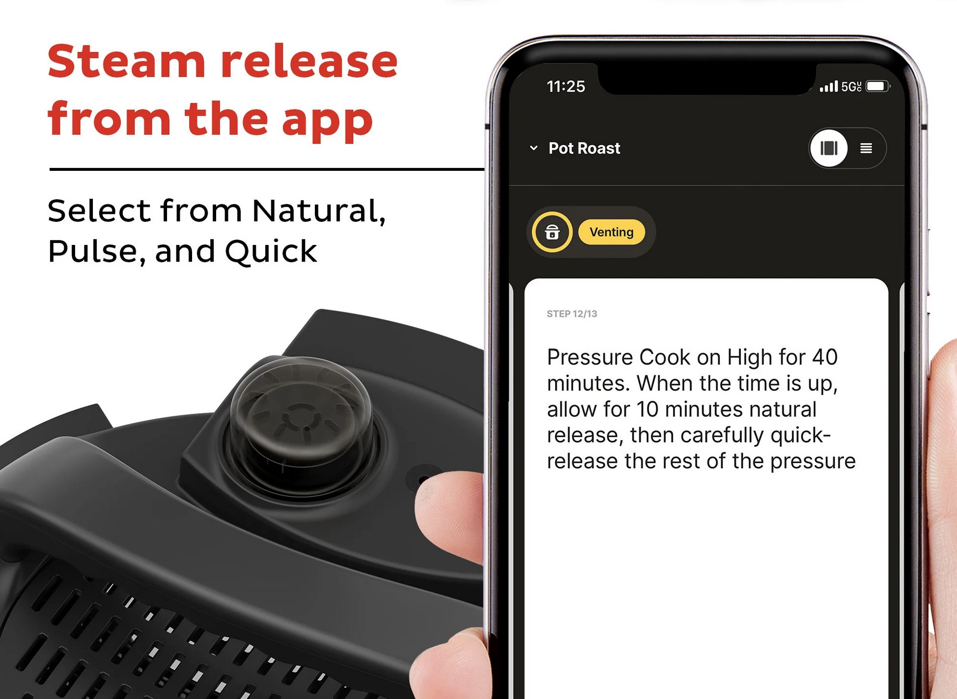 It has three settings: natural (30-60 minutes), pulse (about half that time), and Quick (5-10 minutes).  Natural is best for high-starch foods that expand during cooking. Pulse venting uses timed bursts every 15 seconds.  Quick releases a steady stream of steam for the impatient cook who wants to see what is inside.