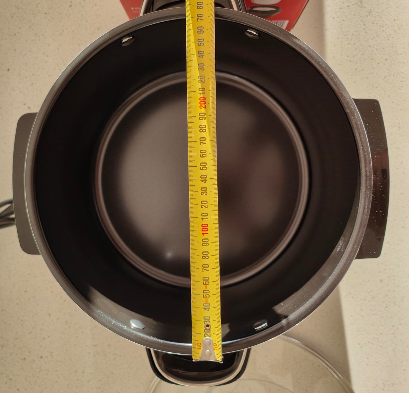 This slow cooker arrives in a big box—the first hint that it is a larger one. The dimensions are 35.5 round x 26cm high x 3.7kg. The pot is 28 x 13cm and is almost usable to its capacity, as the slow cooker does not use pressure or heat that tends to make things bubble too much. The glass lid is micro-vented to keep in steam without pressurising it.