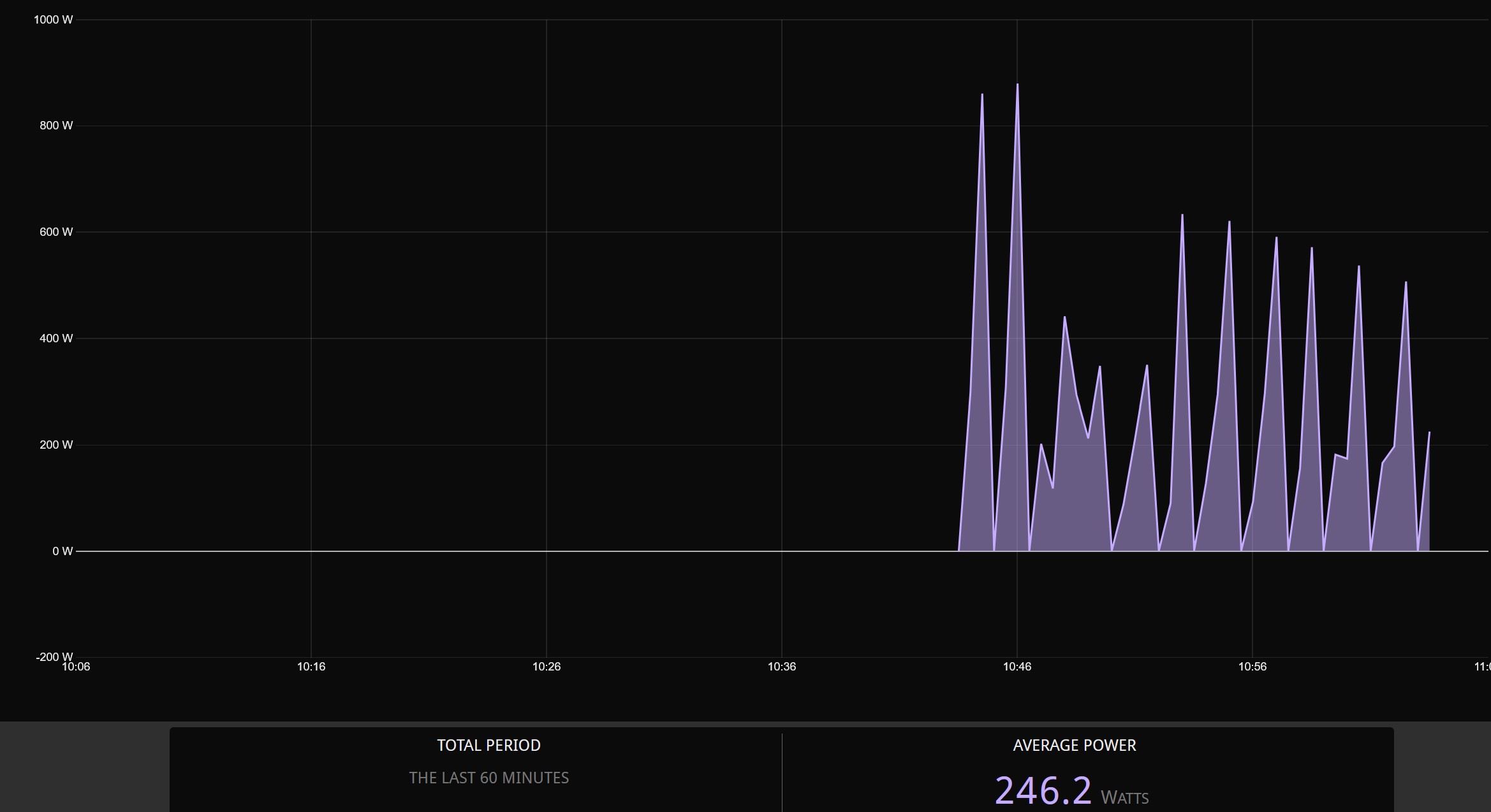 On the low slow cook setting, it peaks at 736W and settles to around 200W.