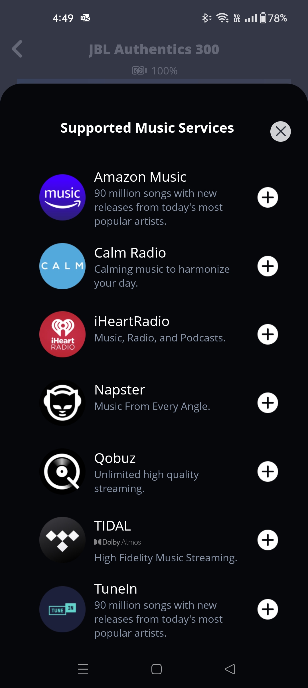 • Select music services: Amazon Music, Clam Radio, iHeart Radio, Napster, Qobus, Tidal, or TuneIn