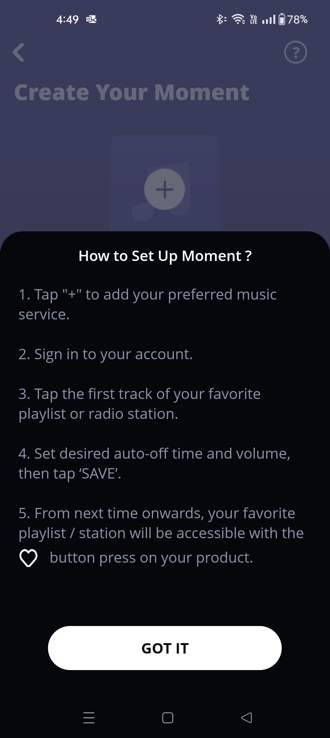 The top has Volume, Bass, Treble round controls, two discrete mics (and a physical on/off switch at the back), Bluetooth, Power and ❤️(Moments) press buttons.