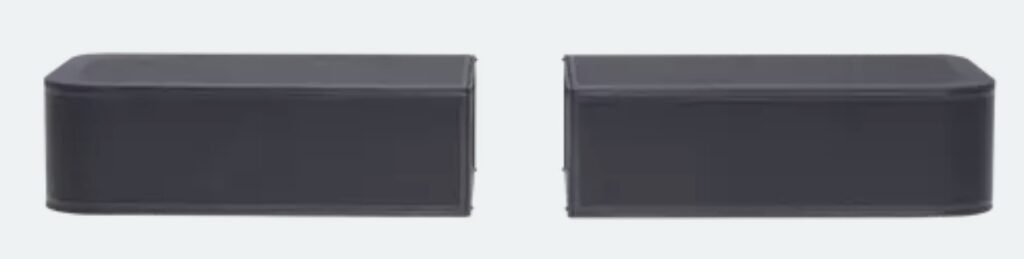 A staggering 11.1.4 channels! The JBL BAR 1300 soundbar and rear speakers are made of high-quality black metal with perforated speaker grills, and the sub-woofer is composite wood. It is big at 1376 x 60 x 139 mm x 6.8kg and deserves to sit under a 65” or larger TV. The sub is large at 305 x 440.4 x 305 mm x 10kg.