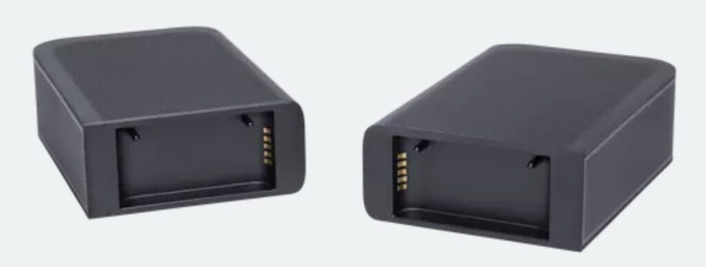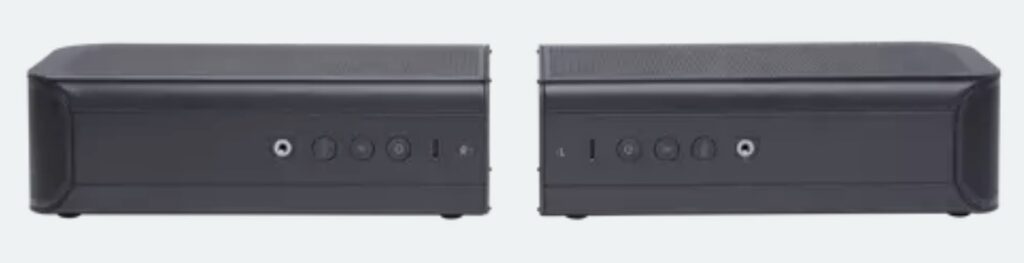 Or you can detach the rears at 202 x 60 x 139 mm x 1.25kg each leaving the soundbar at 1 metre long. They are wireless and ideally should be set up behind the listening position. When attached, they draw power from the soundbar (4-hour charge). When detached, they use their inbuilt 3.6V/6.6A/24W batteries for up to 12 hours of sound. Or you can power and charge them with a 5V/1A/5W USB-A PD1 (or PPS smart) charger (5-6 hours).