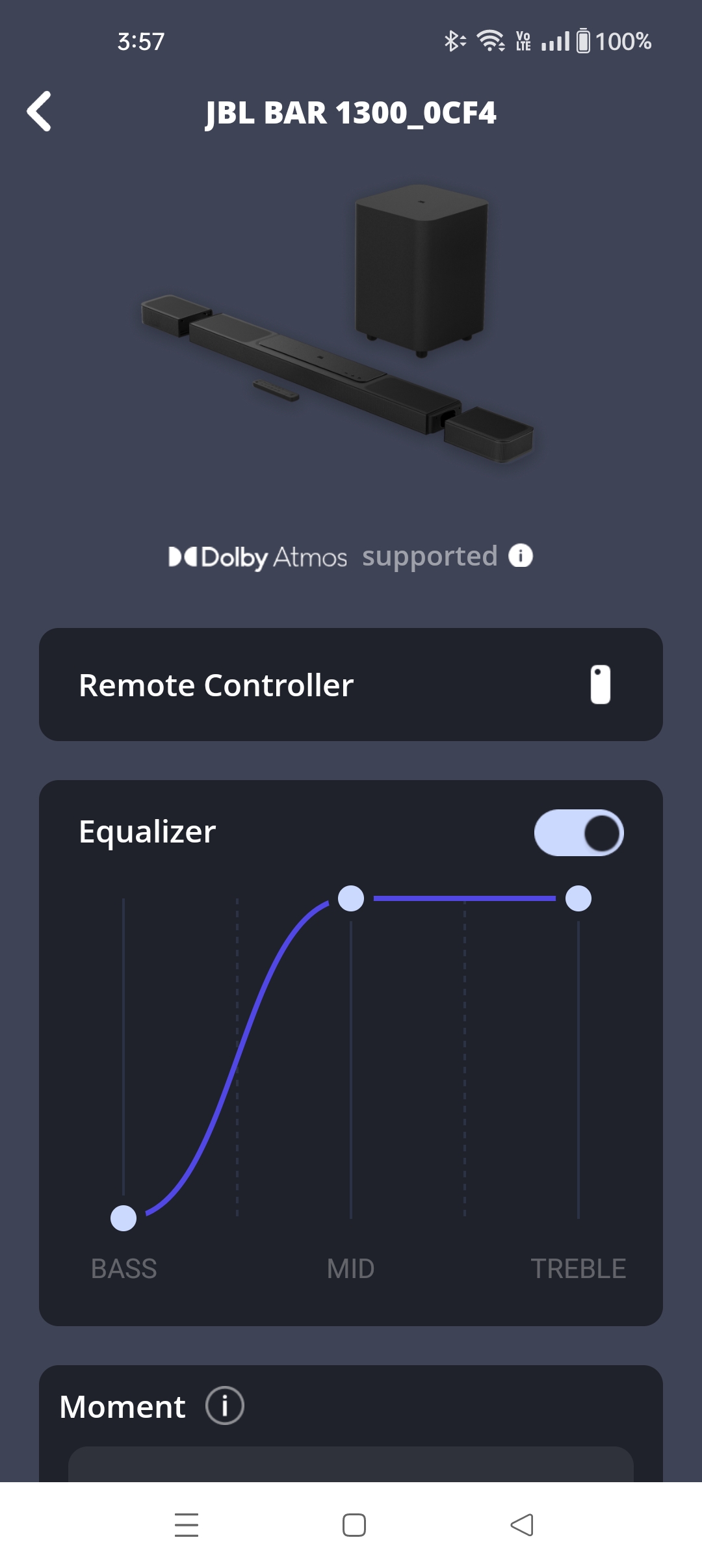 It has a basic EQ (on/off) and three sliders (bass/mid/treble) which don’t do much. For example, if you ramp Bass up with the remote (L1-5), it does not seem to change the Bass EQ in the app. I would like to see a more granular control than three points.