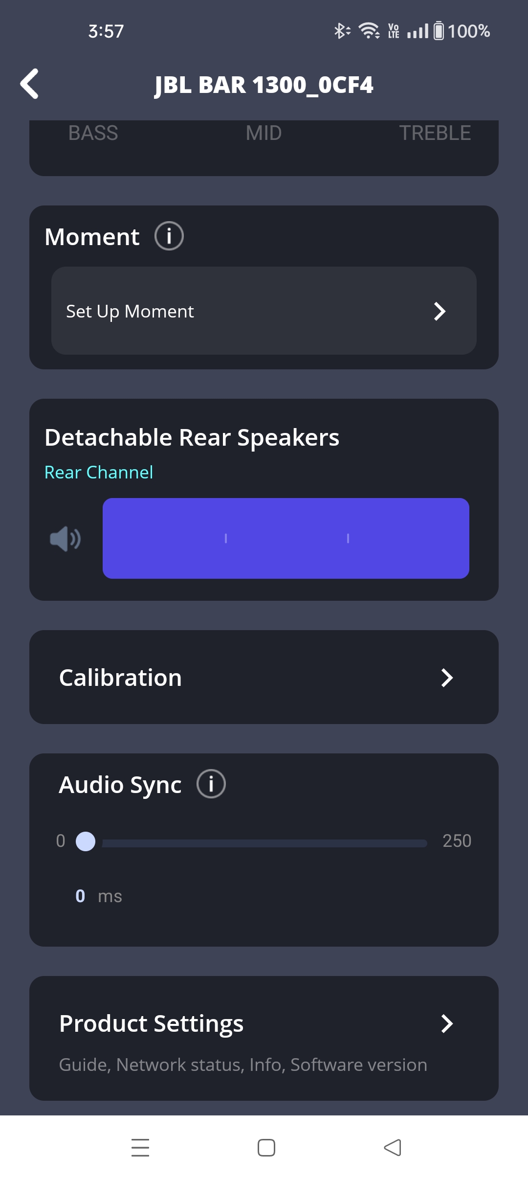 It has rear speaker volume (low/mid/high), which we set to maximum. Again the App did not appear to change when the remote was used to set the volume.