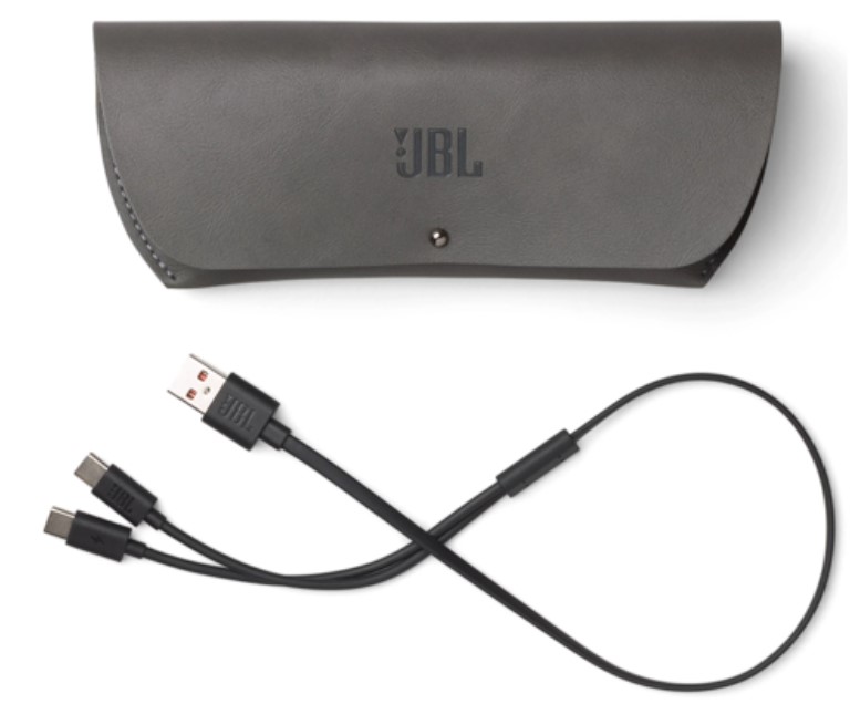 - Volume up/down – tap the JBL logo on the left or right arm.