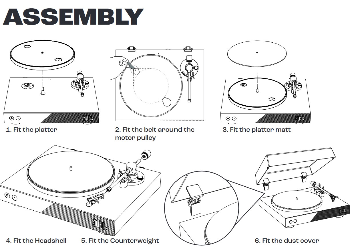 I don’t know what I was expecting – my last turntable purchased in the 70s was ready to rumble. Relax, it is not daunting. The hardest part is placing the drive belt over the drive pully, and JBL provides a piece of red ribbon to do that (don’t throw it away).