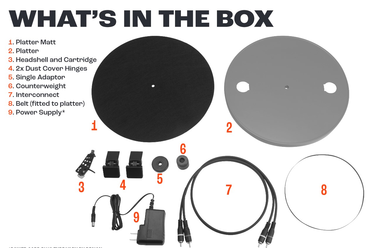 The plinth/case is made from black-finished MDF (Medium-density fibreboard). The platter is diecast aluminium with a rubber belt drive rim. The tonearm is aluminium with a removable headshell, adjustable counterweight, anti-skate adjustment and hydraulic lifting arm. It is easy to upgrade to a cartridge of your choice. The motor has electronic speed control, so it is accurate.
