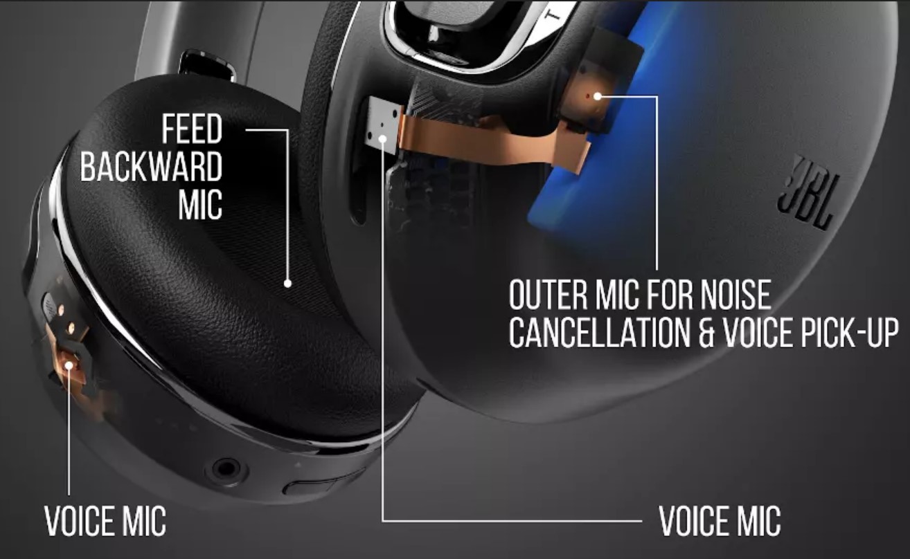 There are two external beam-forming mics, one external noise cancellation and one internal feed backwards mic. It has ‘voice aware’ (side tone) to feed back some of your voice in conversations.