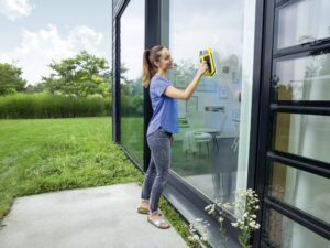 Once cleaned, water remains on the surface, and you can either use the WV 6 Plus window vac or a non-shedding cotton cloth to remove it.