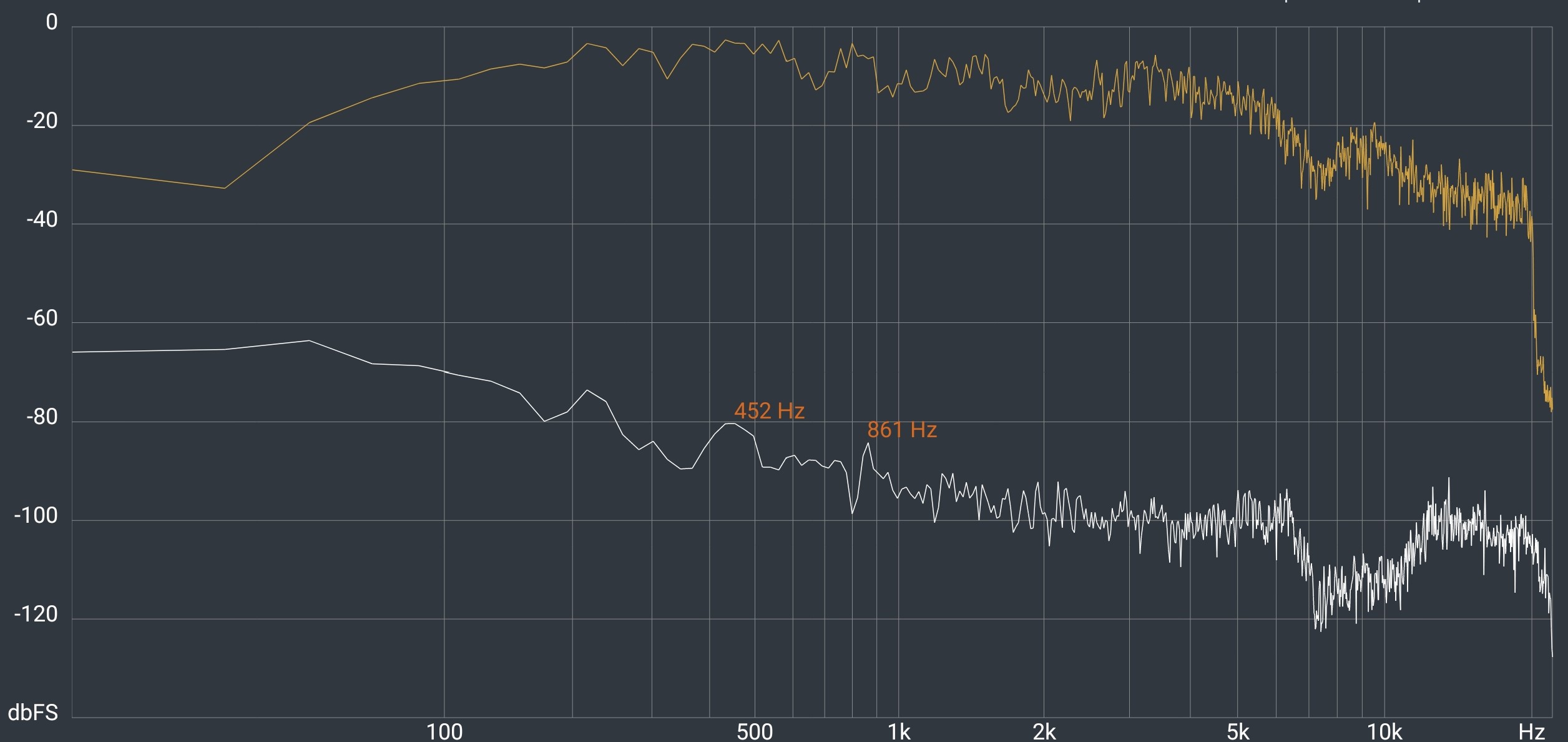 It has no low bass (20-50Hz); mid-bass starts from 60Hz, growing slowly to high bass at 200Hz. This is enough to hear bass but not to feel it. The frequency graph below (gold line) is pretty choppy, meaning it clips the frequencies and lowers the dynamic range. The treble is choppy and lacks the ‘airy feel as if you were there’.