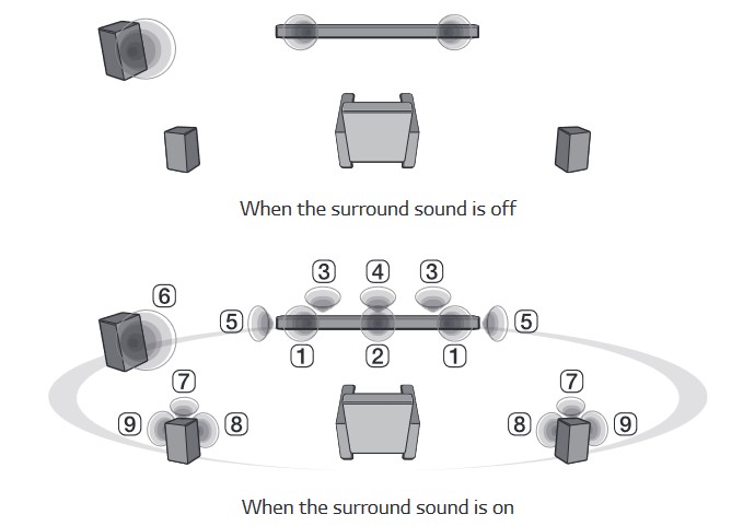 If you enable surround sound, all sound from PCM 2.0 to Dolby Digital and DTS up to 5.1 is upscaled to faux surround sound. We recommend this setting, or all you will get is a front-firing 2.1 stereo, which will be overridden when it encounters DA or DTS:X spatial sound.