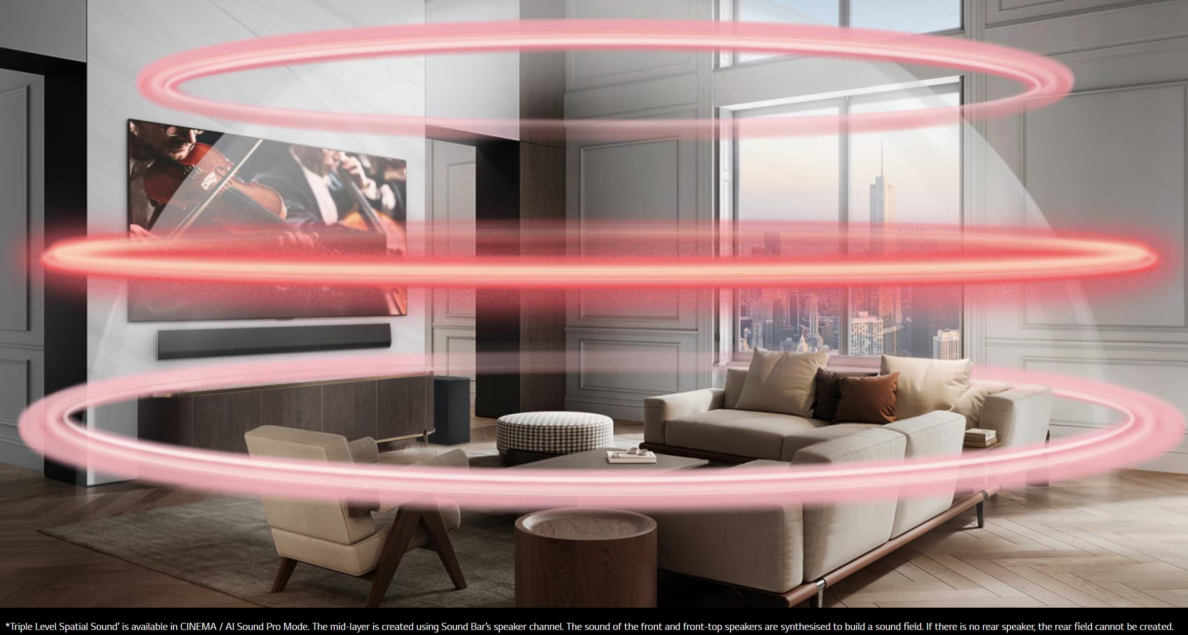 In fact, if you read the fine print in the image below (who does?), LG states Triple Level Spatial Sound is available in CINEMA/AI Sound Pro Mode. The mid-layer is created using the soundbar’s centre channel. The sound of the front and front-top speakers is synthesised to build a sound field. If there are no rear speakers, the rear field cannot be created. Catch 22—it requires a pair of STP8-S 1.0, 50W rear speakers (about A$250), which are not available in Australia.