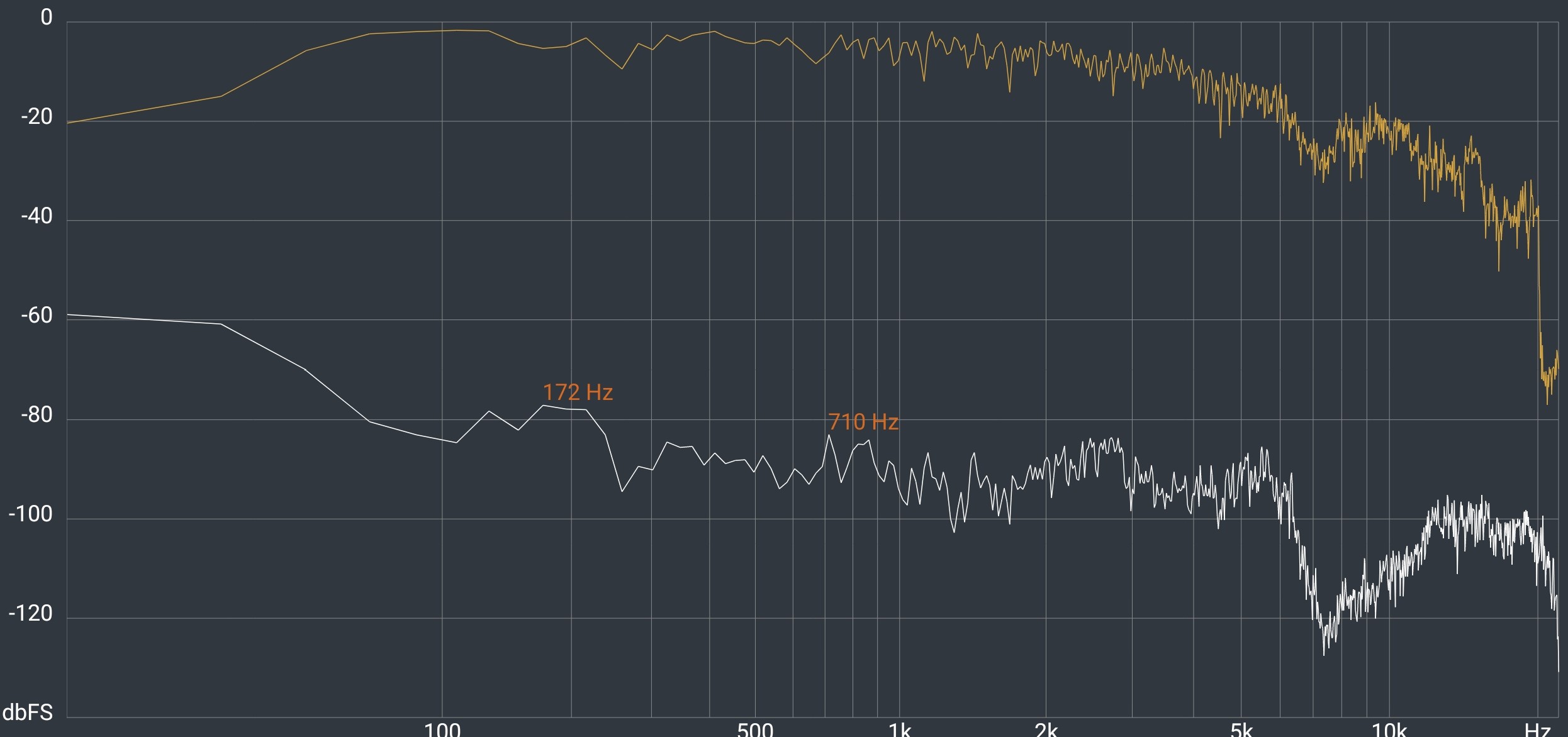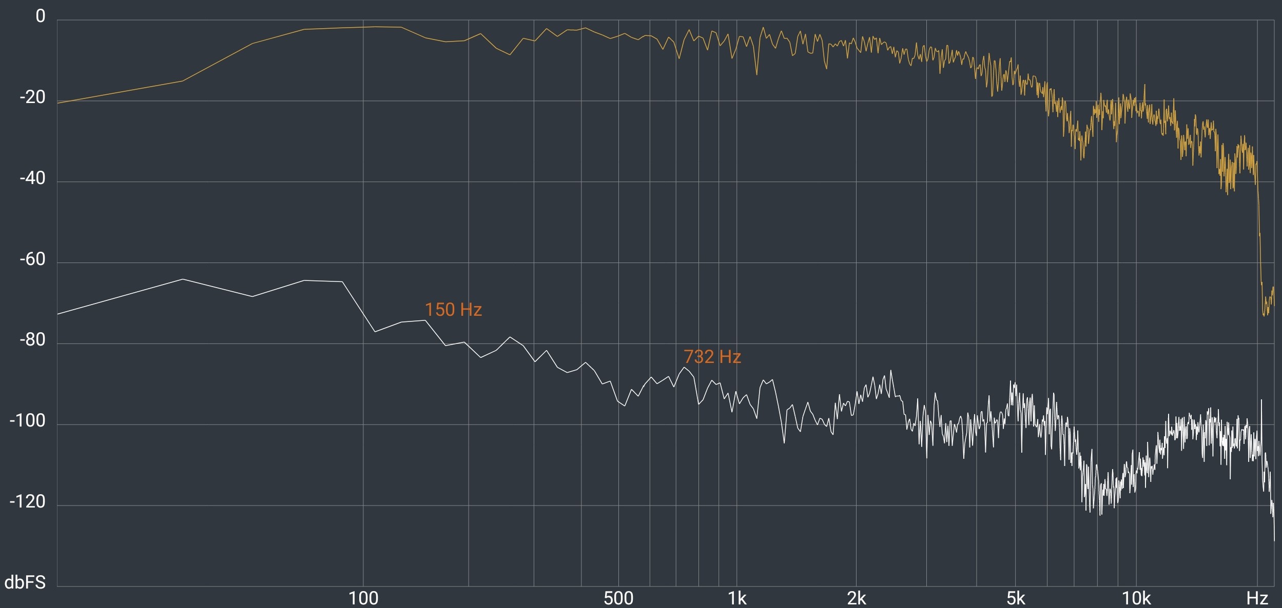 Low bass starts around 40Hz with some room-shaking sound. There is some distortion at full volume (85dB) but not at normal listening levels. It very quickly rises to 60Hz (where you get all the musically important bass) and is flat (good) to 6kHz (amazing). There is a slight dip to avoid harshness, and then it is relatively flat, if a little choppy, to 20kHz.