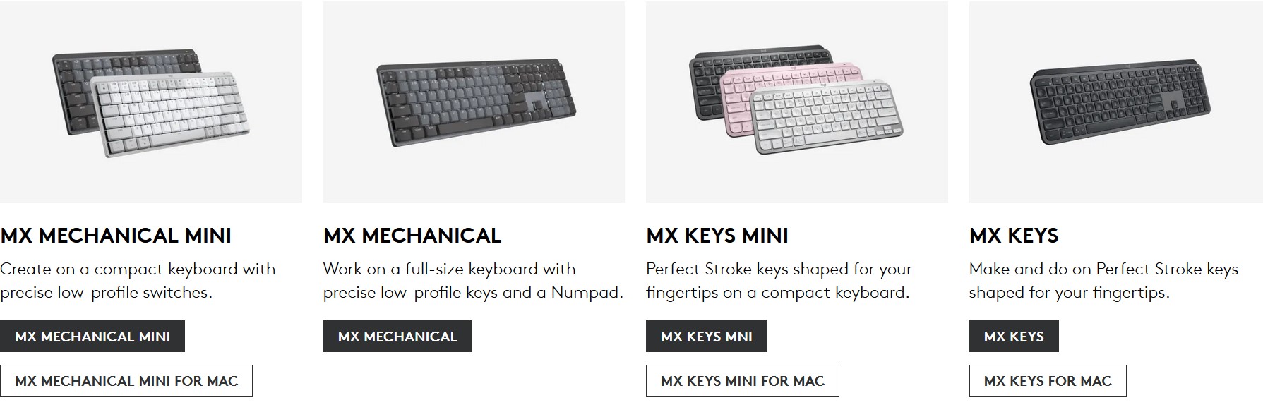 The MX Master range has an MX Mechanical full-size, MX Mechanical Mini, MX Mechanical Mini for Mac, MX Keys full-size (membrane/low profile scissor key), and MX Keys Mini (membrane/low profile scissor key).