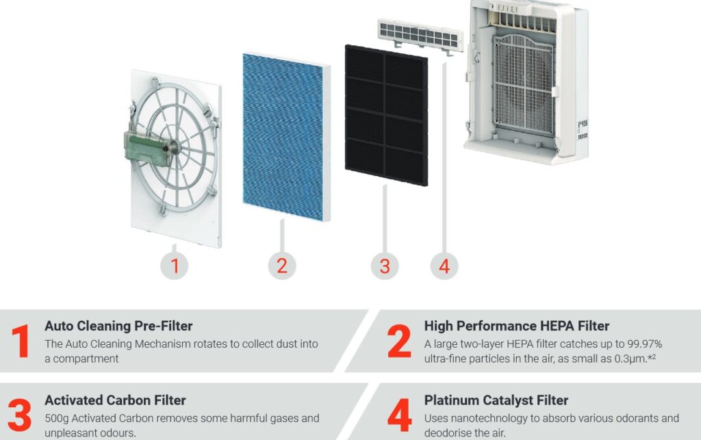 The Mitsubishi MA-E85R-A is its premium air purifier offering covering a large 508m3 area and has some unique Japanese-made technology.