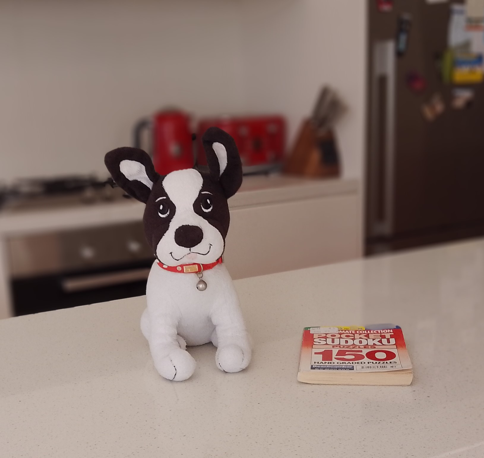 - Indoor office light: Colours are a little muted, and dogs’ face/ears are grey instead of deep black