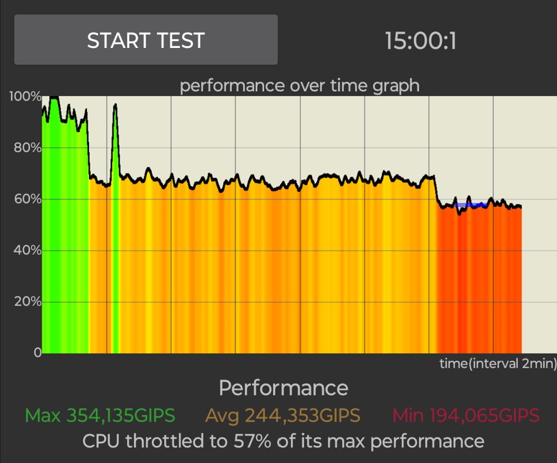 It throttles 43% over 15 minutes and never recovers. Maximum GIPS is 354,135, but it drops to 194,065 and stays there. Typical users won’t notice, but gamers and heavy users would be most affected.