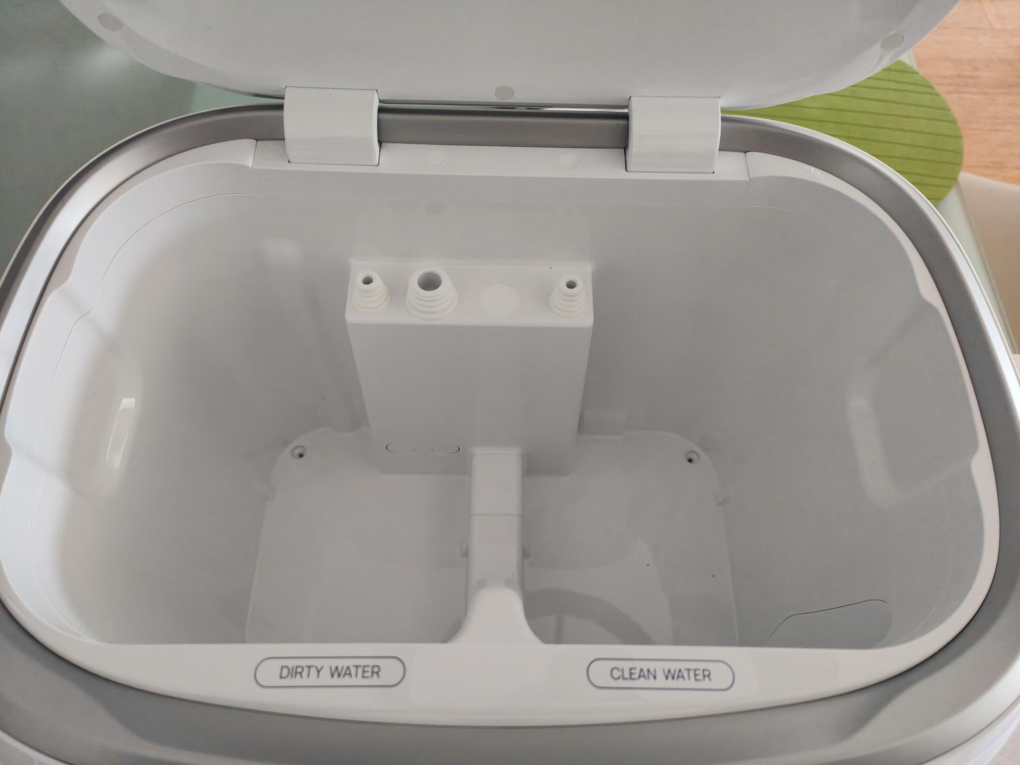 It has clean 4.5L and wastewater 4.1L tanks but no sensors to show empty. A 903ml bottle of Lemon and Basil Detergent fits inside, and no sensor indicates if it is empty.