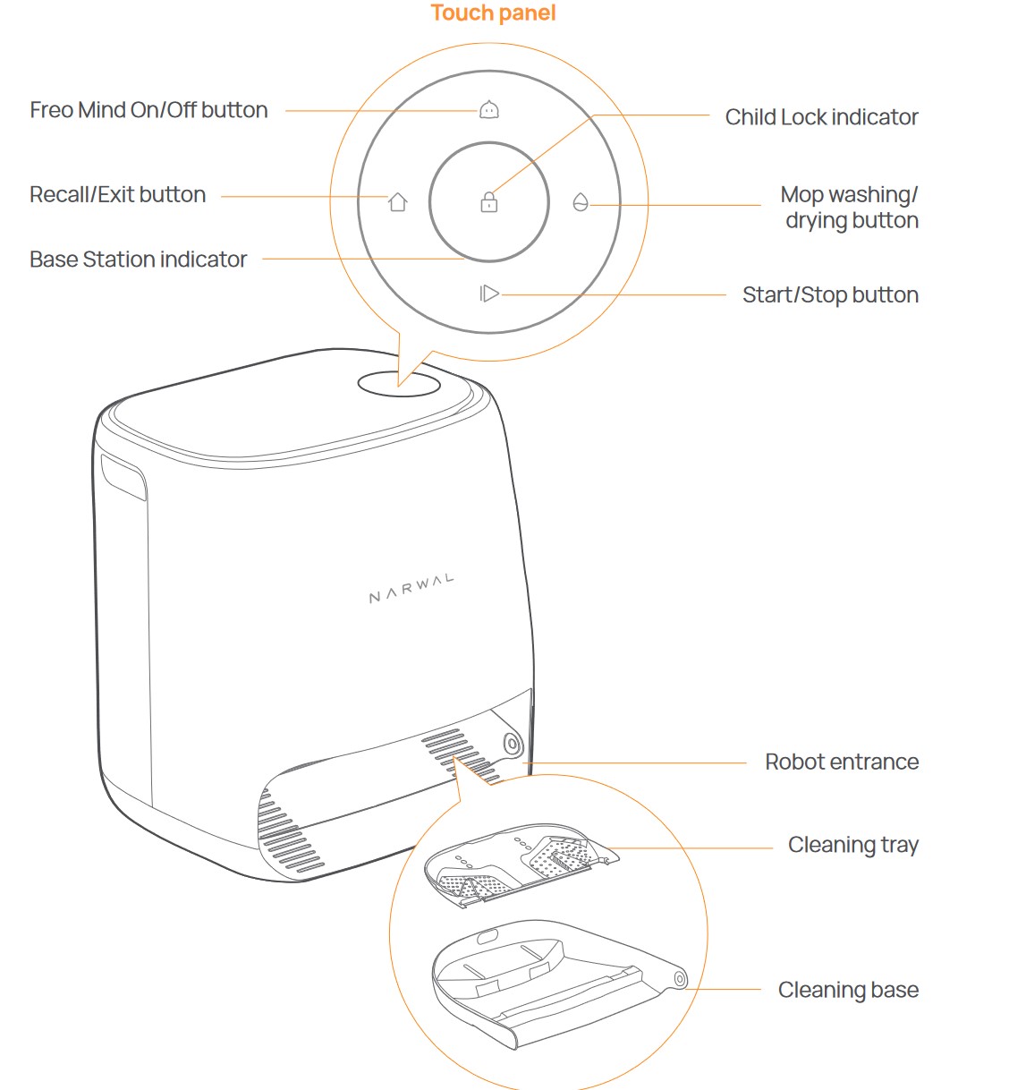 It connects to your smartphone via Bluetooth 5 and to the router via Wi-Fi. The touch screen offers Start/Stop (default cleaning as per app settings), Home, Freo Mind on/off, Child lock, and manual mop washing/drying.