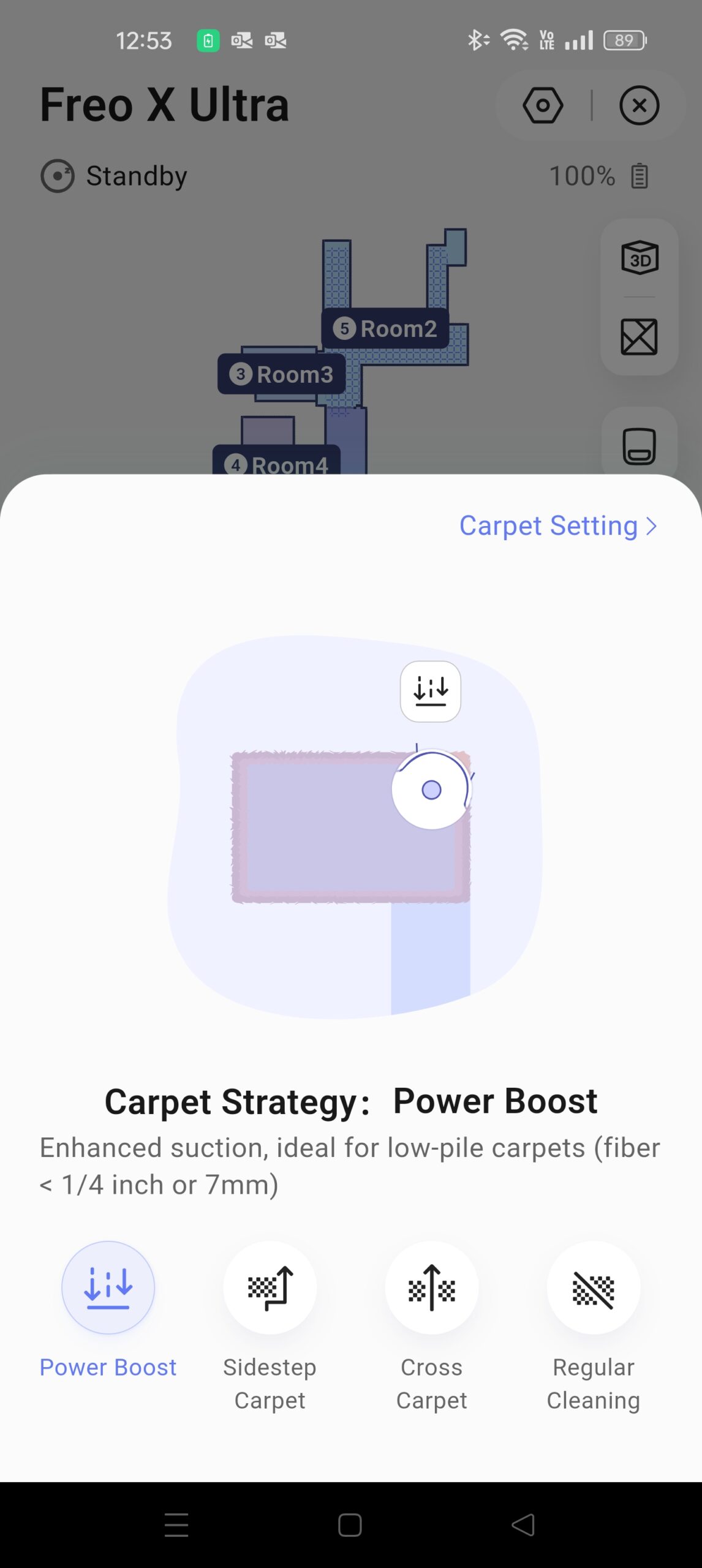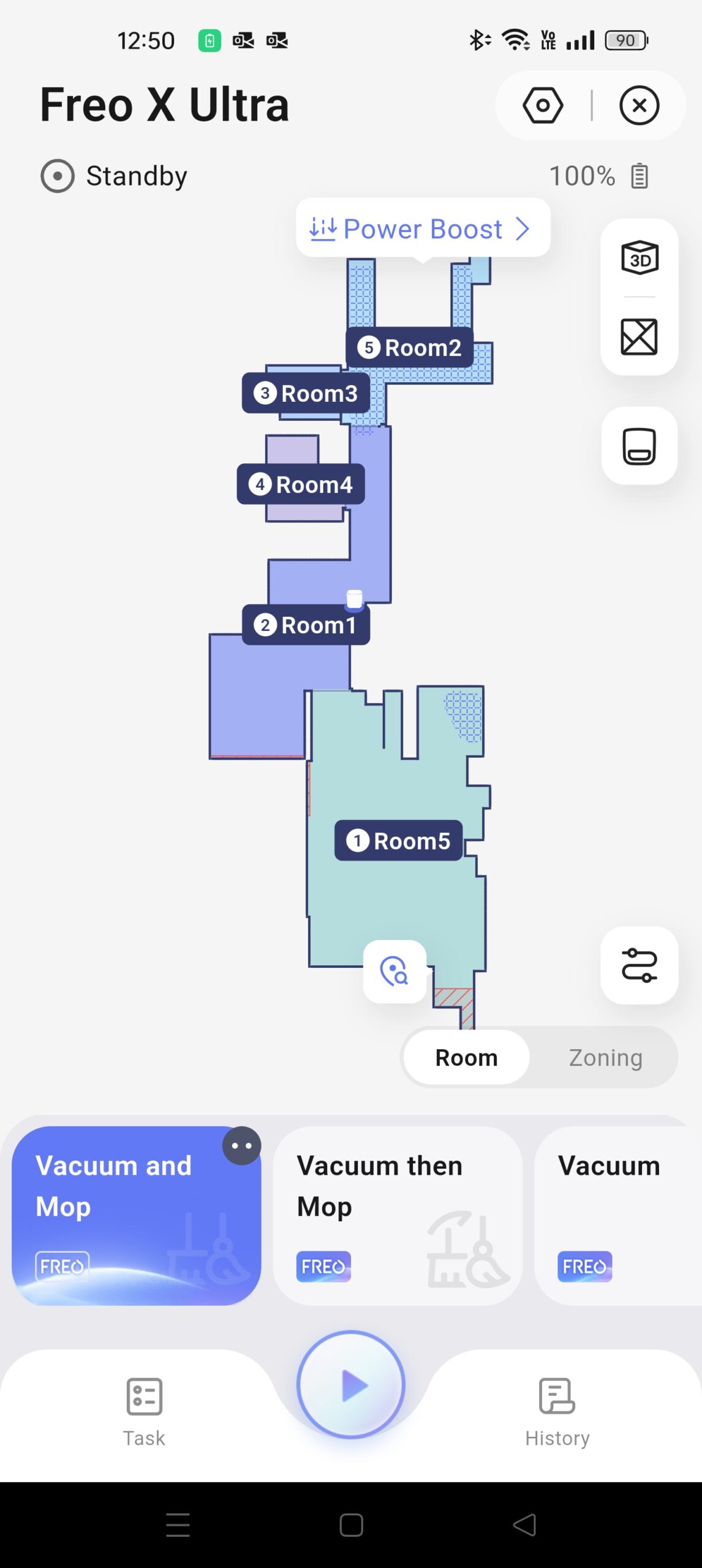 Most Gen 4s cover about 1m2 per minute. With its smaller brush, that time at least doubles, and if you select 2X mode, it can quadruple. When Freo Mind (automatic mode) is enabled, it vacuumed/mopped a 90m2 area in 170 minutes. Without Freo Mind, it was about 114 minutes.
