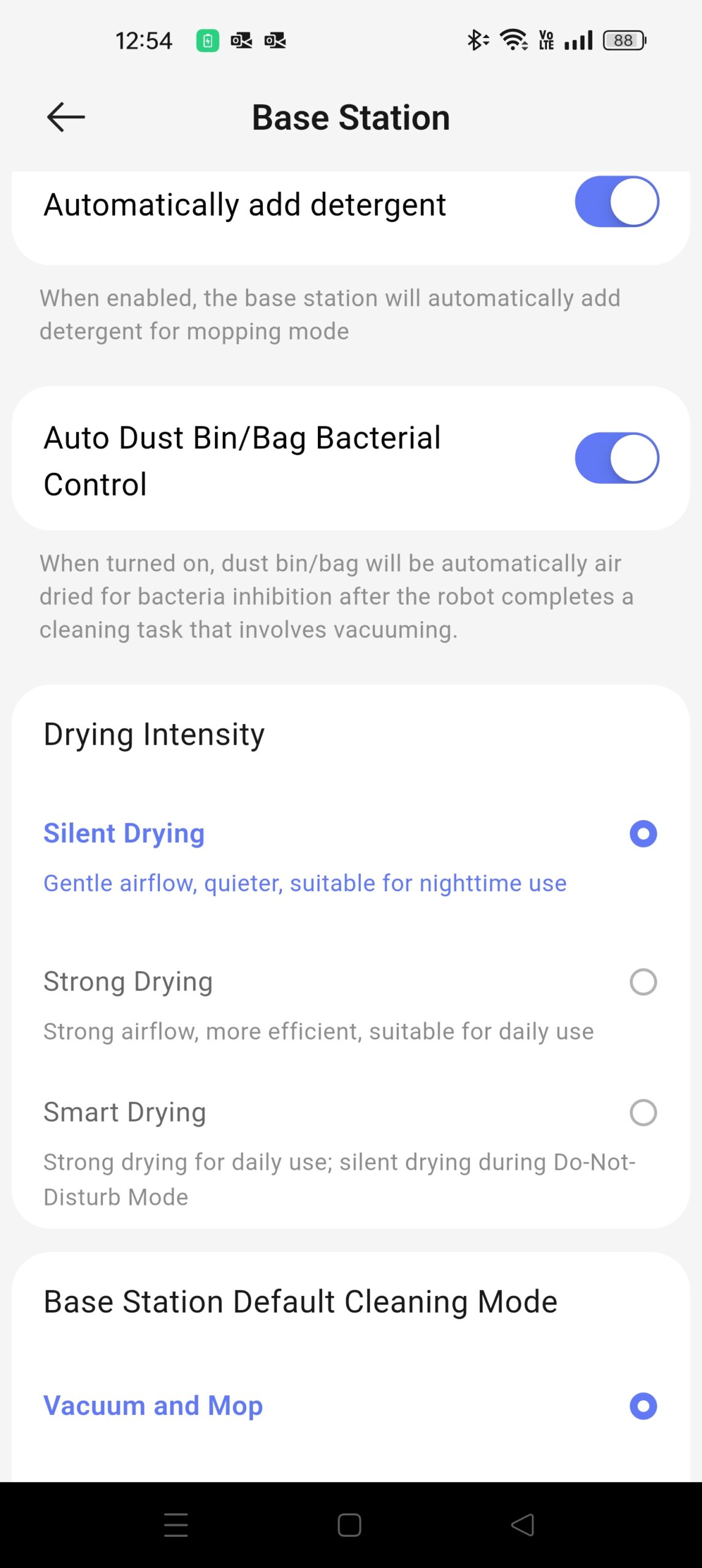 It then 40° warm air dries using either Silent, Strong, or Smart Drying (mixes silent and smart according to time of day). The warm air also dries the robot’s internal dustbin.