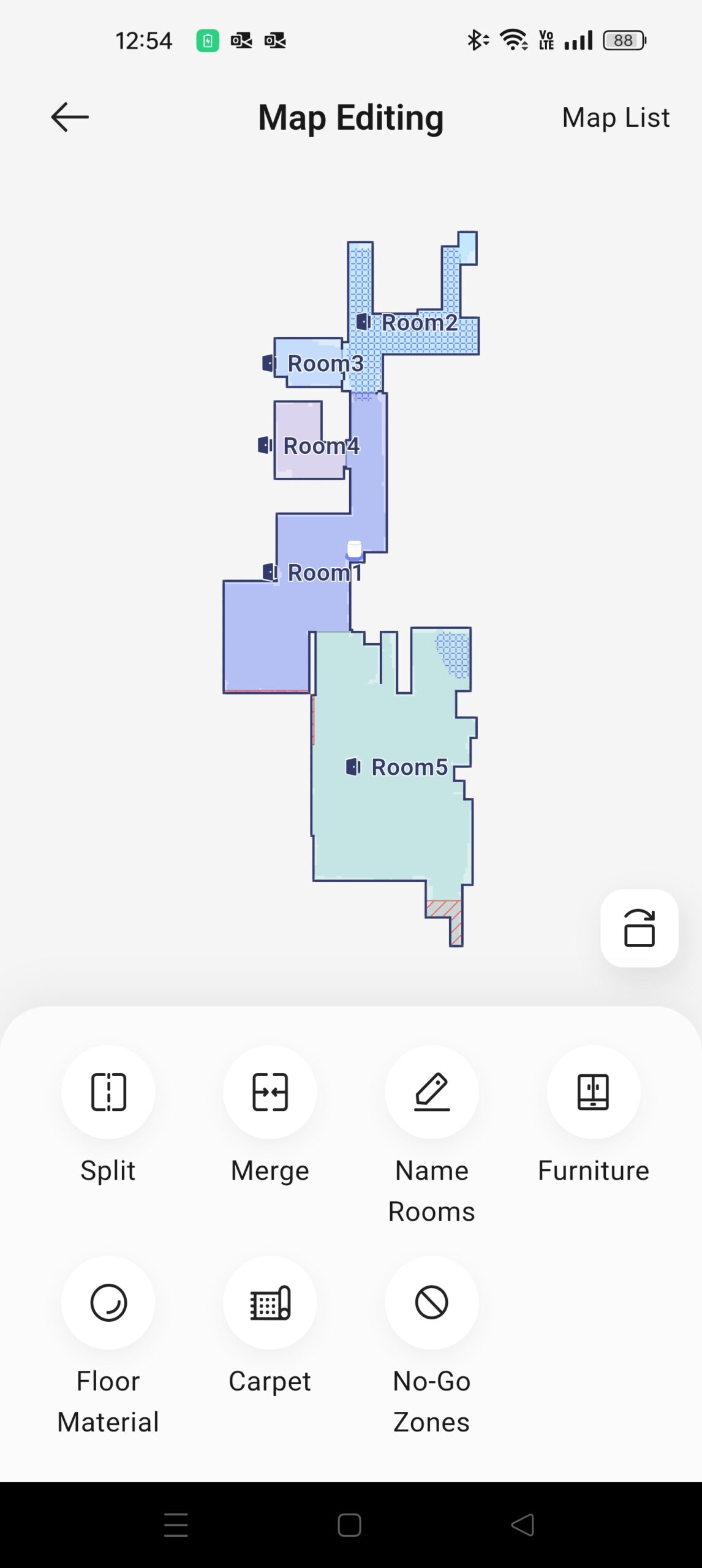 We found setting accurate no-go zones and barriers more difficult than with other apps. It also had an issue in room five: It did not identify a substantial island kitchen bench and we would have liked to split the room to give the kitchen area behind its zone (we can do this in other apps).