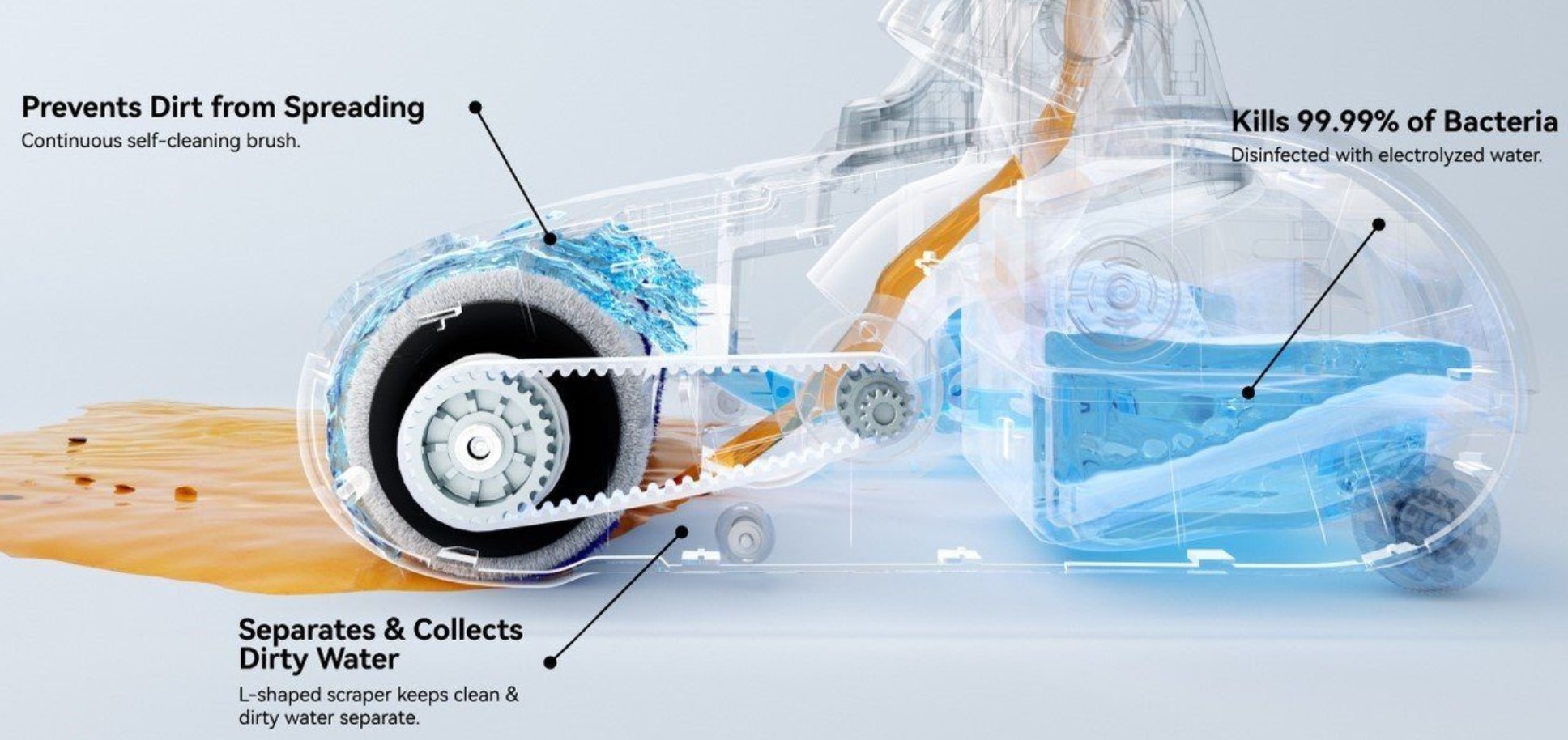 Like all, clean water (electrolysed in this case) is supplied from a clean tank to a rotating roller and dirty water is squeegee/bladed off to the wastewater tank. The vacuum provides additional suction to help the mop and improves one-pass cleaning results.