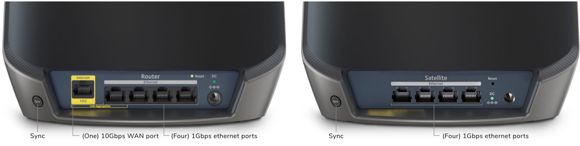 The router and satellites look the same – the router has a Yellow 10Gbps WAN Internet port and four gigabit Ethernet LAN ports. The satellites have four WAN/LAN ports – one can be used for ethernet backhaul.