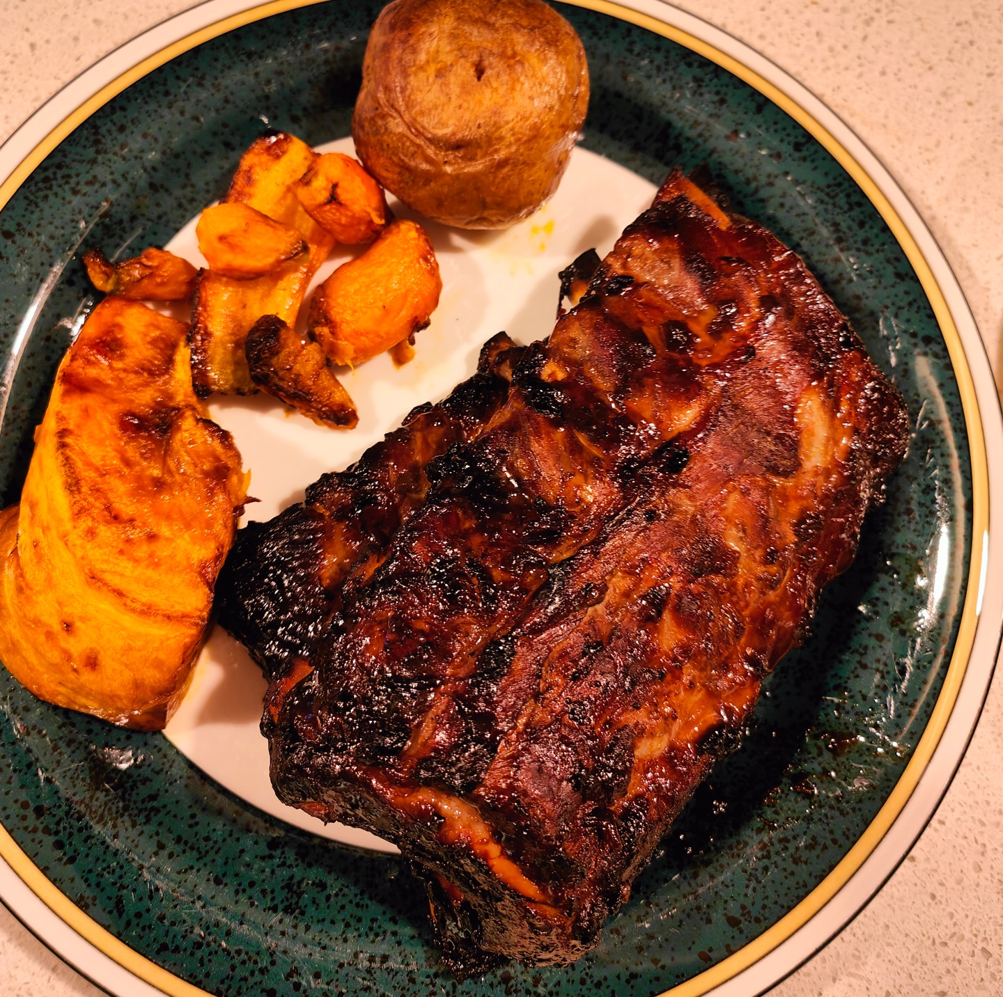 Suffice it to say that the ribs turned out well. They had a nice smoky flavour, and the marinade was not overpowering. I used a Ninja Foodi AG301 circa 2019 (long superseded by the Ninja Foodi Smart XL Grill & Air Fryer – AG551, but we use it pretty well every day) to roast some potatoes, pumpkin, and carrots, and we had a great dinner at a fraction of the restaurant price.