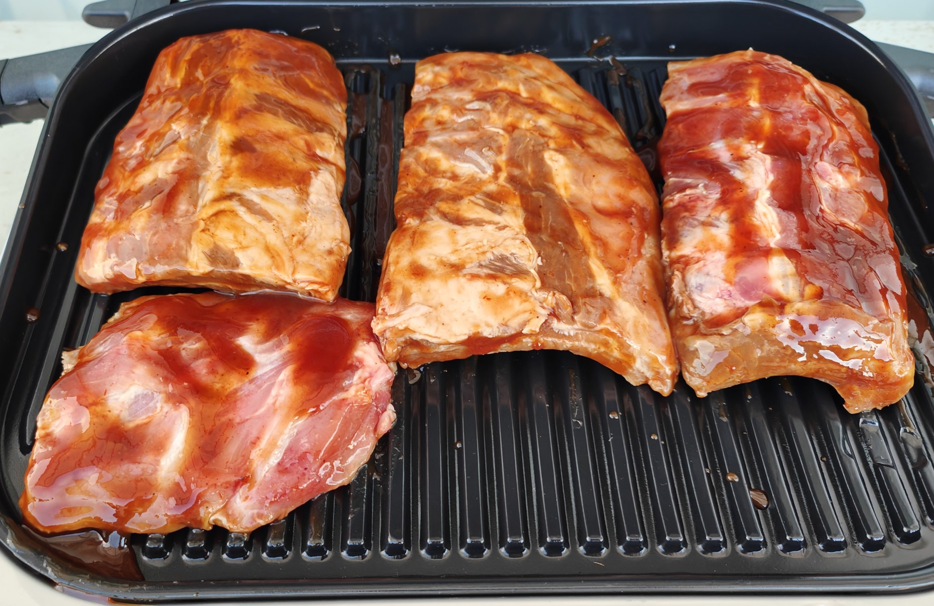 We later read the manual, and indeed, ideally, the ribs require either a dry rub or marinade, so we used the Masterfoods sauce and marinated for 24 hours.