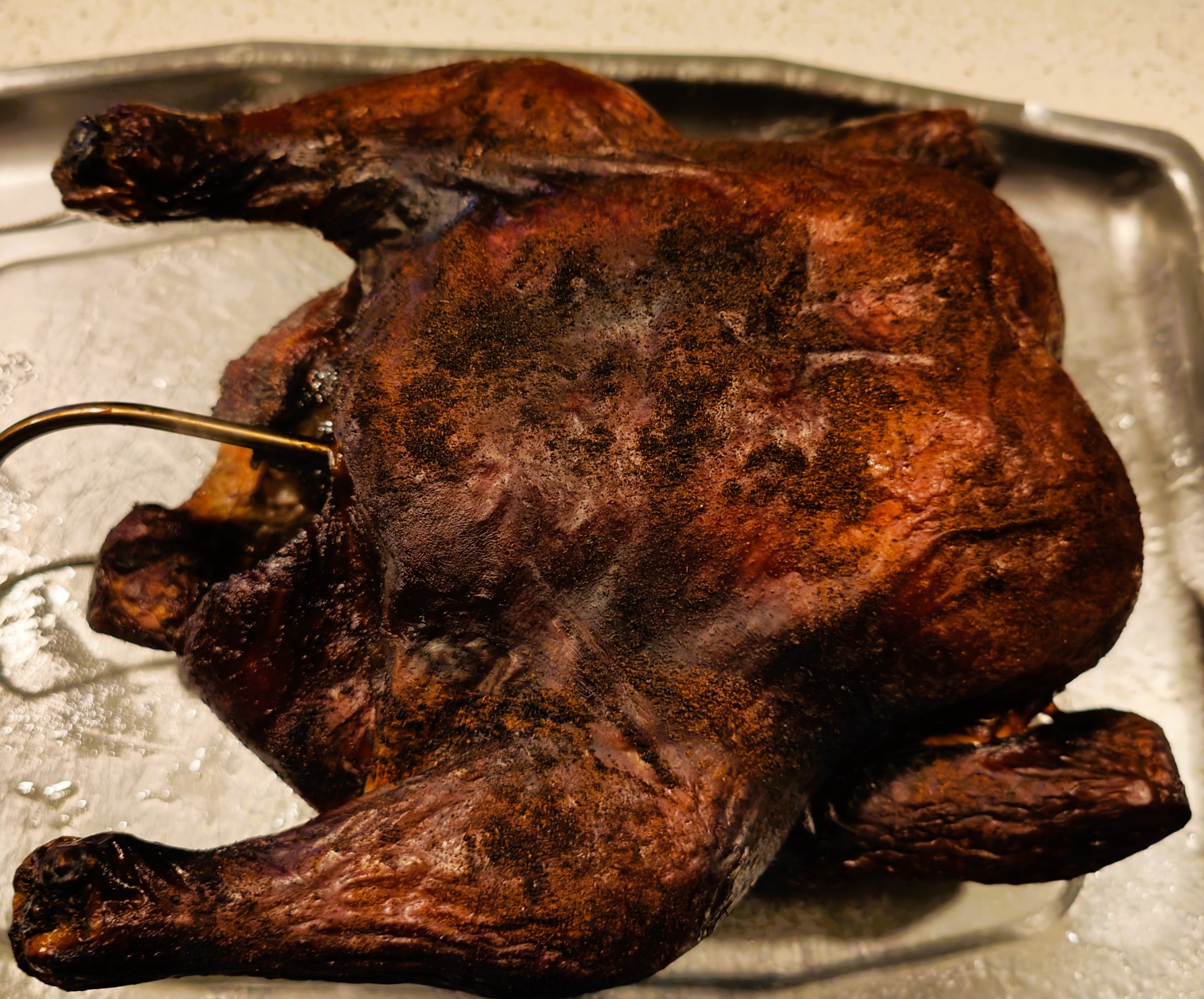 To our surprise, the chook looked rather blackened, and we thought we may have done it for too long. Not so. The skin was dark brown, smoky, flavoursome and crisp, and the meat was perfectly cooked with a pleasant sweeter smoky taste.