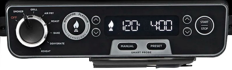 The panel has a rotary knob for off, smoking, grilling, air frying, roasting, baking, dehydrating and reheating. There is a separate Woodfire Flavour button that you can use for the above (except reheat).
