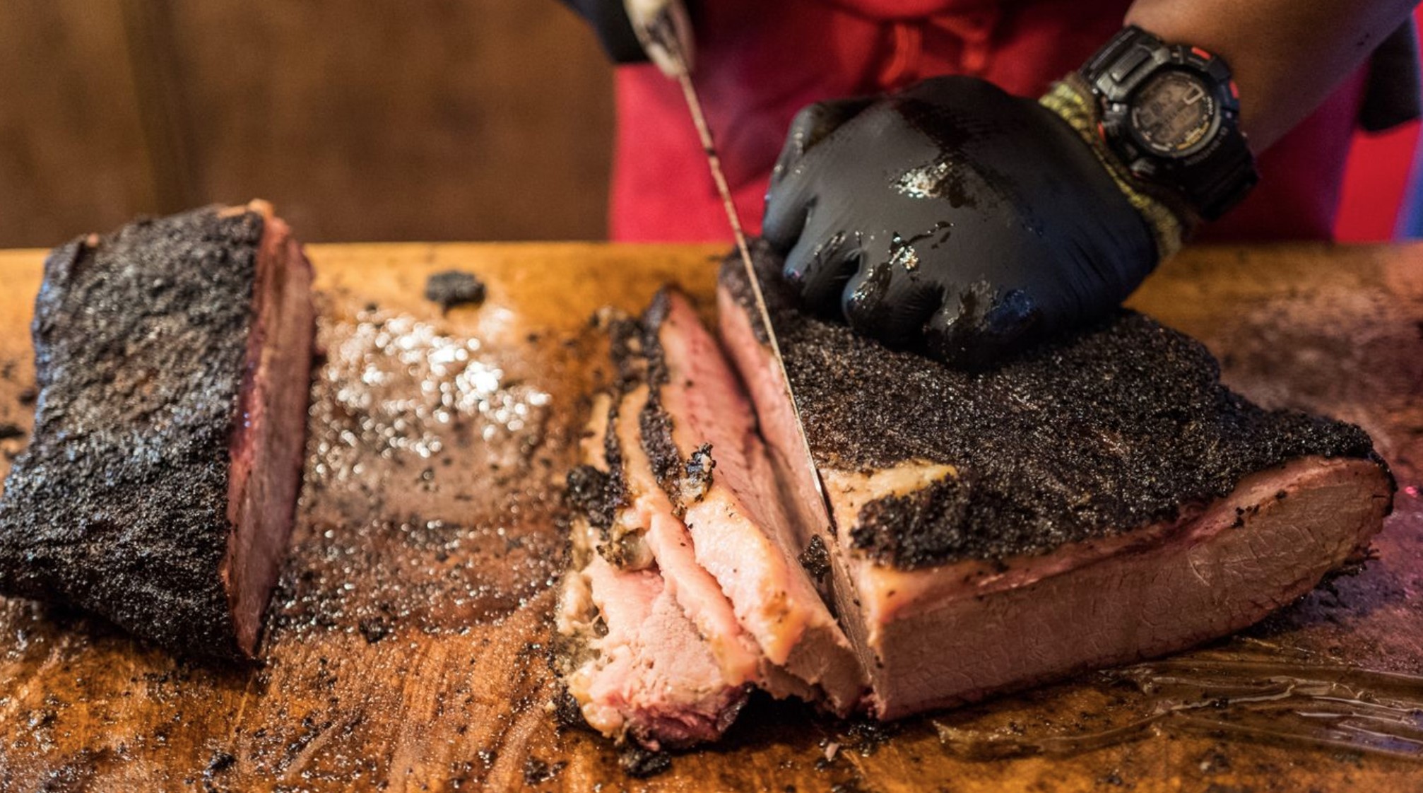 I have watched some of the Texas Pit Master TV shows, and it seems to involve long hours (usually a day or more) of basting big lumps of meat over low heat (50-80°) in a wood-fired smoker. The smoke comes from oak, beech, hickory, mesquite, pecan, alder, maple, and fruit tree woods, such as apple, cherry, and plum. It imparts an intense, deep, smoky flavour to the meat. These pit masters are the experts, and unfortunately, no home device will ever replicate that technique.