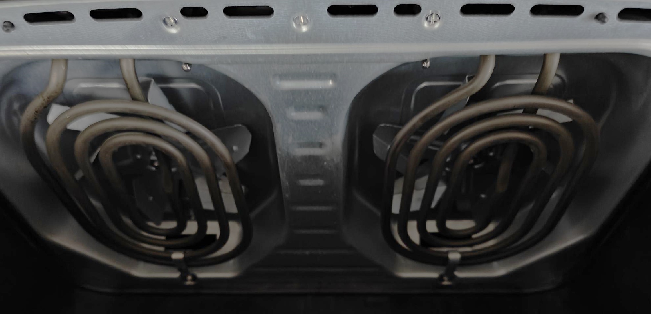Inside are two 120 x 80mm heating elements and fans. There is no fat splatter guard, so you must regularly clean the elements and surrounds.