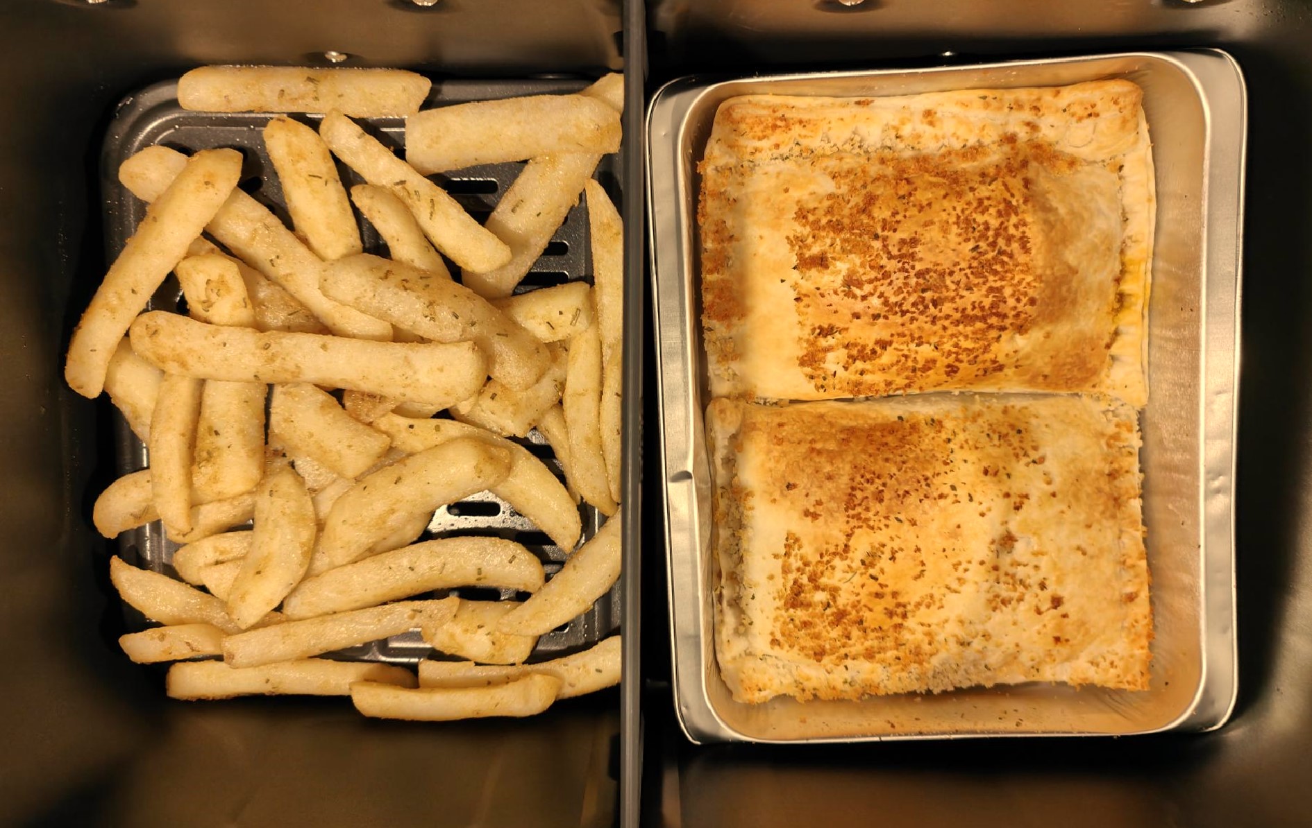While there are a few dual-zone air fryers, this massive 10.4L capacity single draw can be divided into 2 x 5.2L zones, each with a different heat, time, or mode. Roast on one side, air fry on the other, and let the cooker work out cooking times to end simultaneously (Smart Finish).