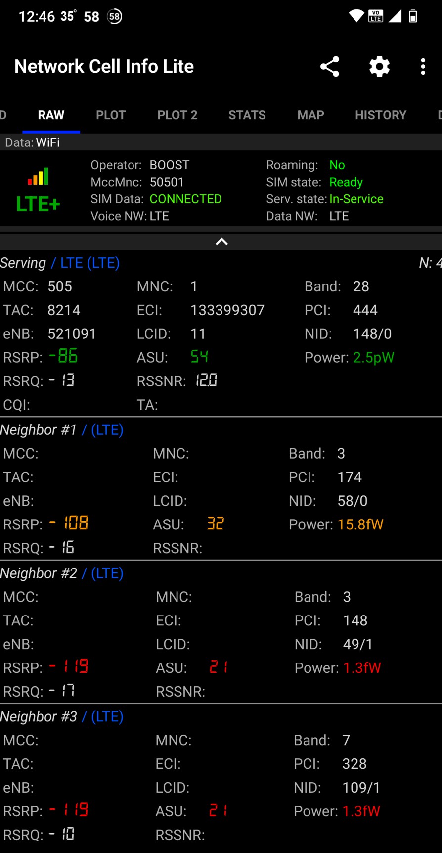 Nokia XR21 has a dual SIM or SIM/eSIM, DSDS (one active at a time), and dual ring tones. It finds the closest tower at up to 2.5pW (good). While it finds the other three towers, these are unusable.