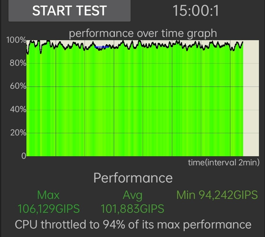 | Throttle 15-min test | Max: 106,129GIPS, Average: 101,883, Minim: 94,242 – 6% loss over 15 minutes CPU temp reached 32° This phone barely throttles under load, reflecting OPPO’s excellent thermal design. |