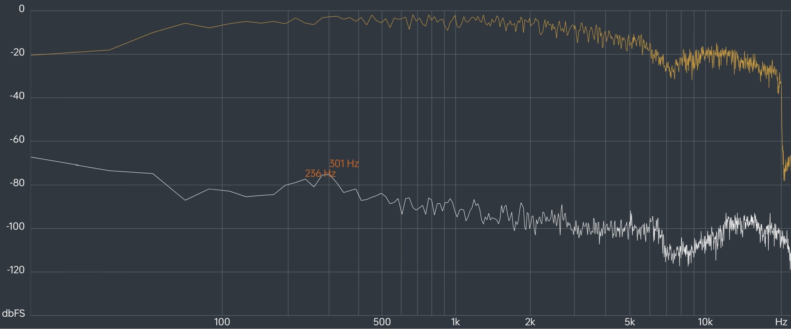 Gold line above – Mid-bass starts at 50Hz and quickly builds to 80Hz, where the sound signature is flat (neutral) to 20kHz.