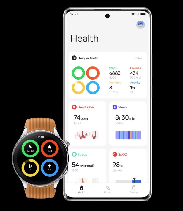 While it runs Wear OS, you cannot use that app. An OHealth app overlay records fitness data and provides access to about 100 watch faces (these support Hybrid mode). You can share your personal data with Google Fit, Health Connect, and Strava. It does not (as far as we are aware) pair with the Google-owned Fitbit app.