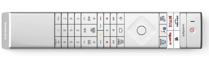 The Google Assistant remote is backlit and has an interesting design, even though it is a relatively standard Android TV 10 design with the addition of an Ambilight button. It pairs both via BT and IR.