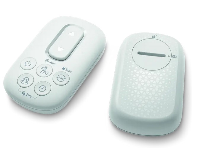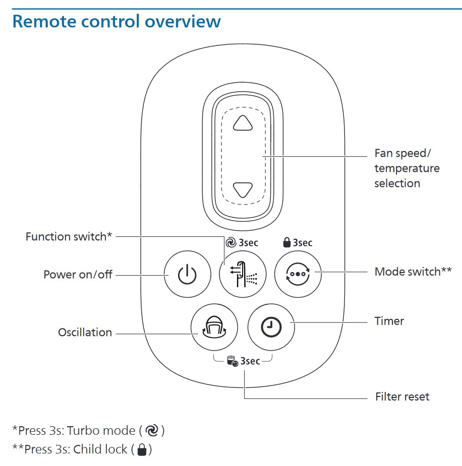 It has a remote (coin battery) that magnetically clips to the top of the tower (as does Dyson).