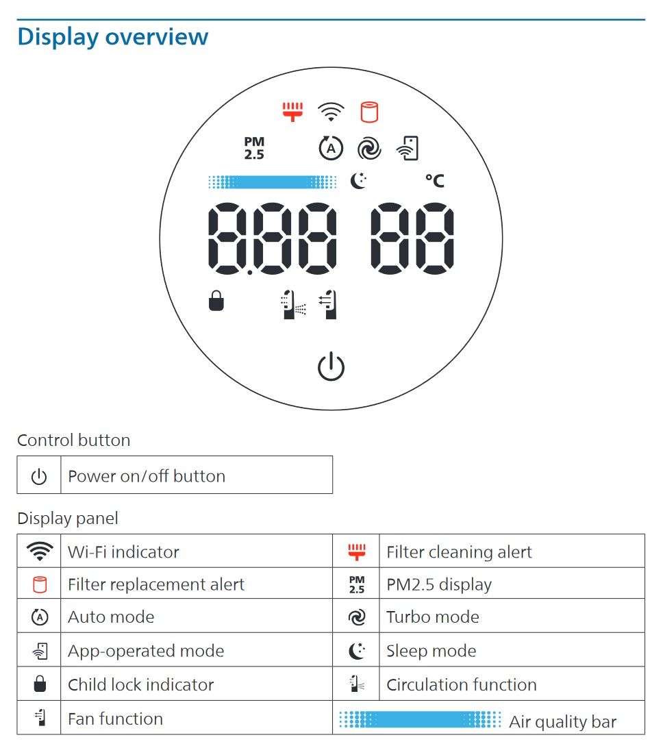- Real-time reporting on the machine of PM2.5, PM10, HCHO, VOC, NO2, Filter status, and air quality over the past few hours and 24 hours. It also shows the room temperature, humidity, Wi-Fi setup, and fan/airflow speed (Philips gives PM colour bar, temperature and humidity).