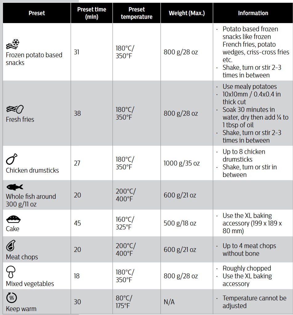 Philips adds value by including several pre-sets – frozen snacks, fresh fries, meat, fish, chicken drumsticks, cake and grilled vegetables. These simply select the right temperature and time.