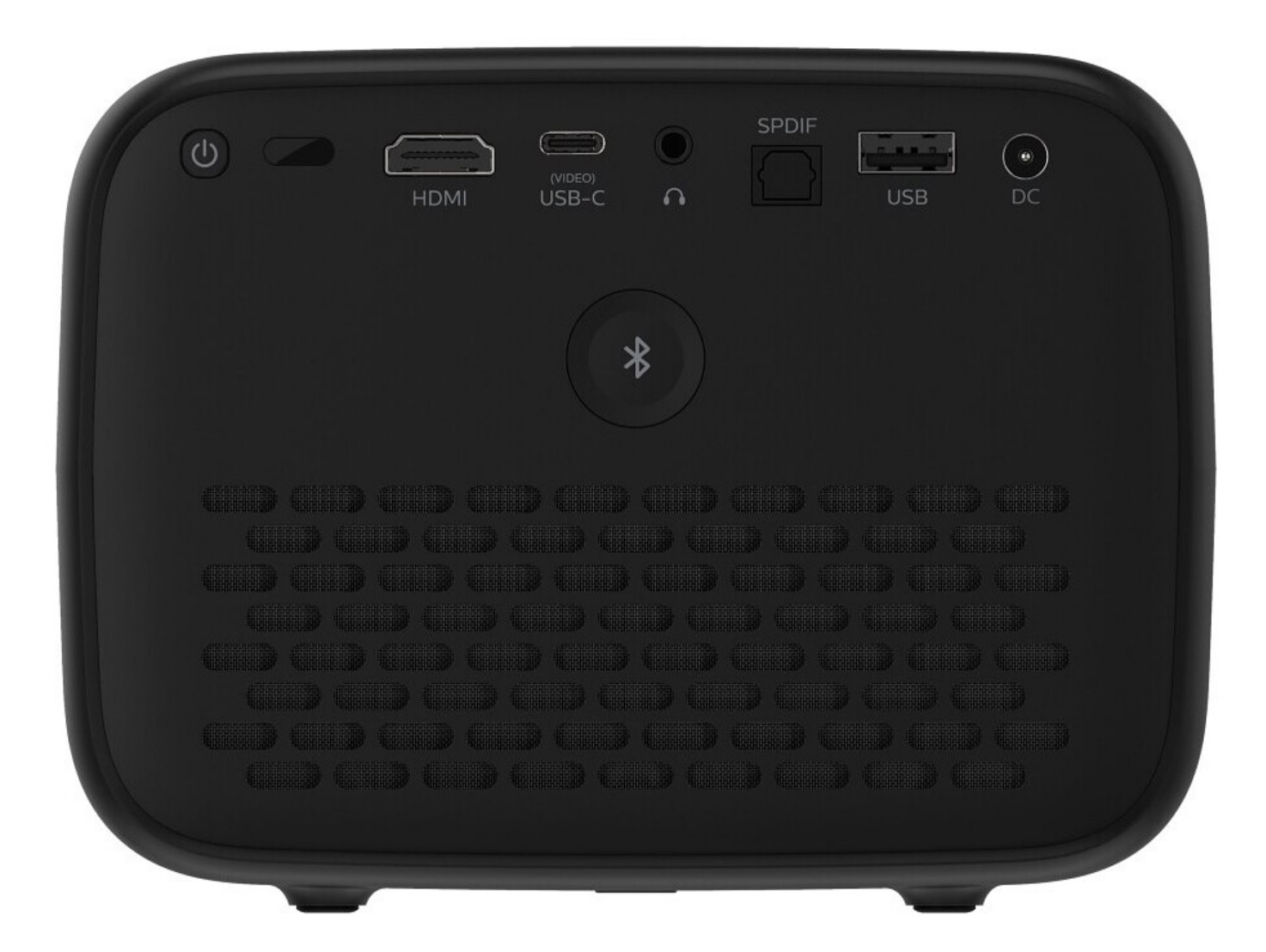 It is a matte black cube 158 x 150 x 119 mm x 1.96kg with rear inputs, top touch-sensitive buttons, side and rear ventilation and a front lens with a protective shutter.